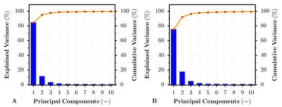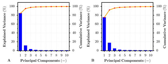 Explained and cumulative variance for the first 10 principal components of PCA-transformed pigment-based (A) and dye-based (B) inkjet-printed HS image. The result correspond to the dye- and pigment-based test prints on the Cotton Textured inkjet art paper.