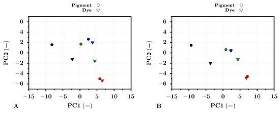 The results of averaged pixel values of the print color targets transformed by the PCA method into the pigment-based coordinate system for dye (triangles) and pigment-based (circles) prints. The results are shown for the first two principal components PC1 and PC2. The point color represents the particular color target. Subfigure (A) represents the results for the test images printed on the PRO Pearl photo paper. Subfigure (B) presents the results for the test images printed on the Cotton Textured art paper.