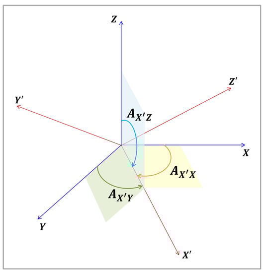 Figure 1 shows two different coordinates systems, represented by the orthogonal reference frames and . It also presents the angles between axis and each axis of the frame, which will be used in the coordinates transformations between the frames. The others angles that each axis forms with the axes of the other frame are not shown in Figure 1 for the didactic purposes.