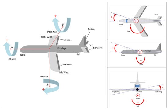 The yaw movement is the turn to the left or right of the nose of the airplane, provoked by the action of the rudder. In other words, it is a rotation in the axis normal to the plane formed by the wings and the fuselage. The pitch movement consists of turning the nose up or down, and it is generated by the movement of the elevators, located in the tail of the airplane. This is equivalent to a rotation in an axis along the wings. Finally, the roll movement is the rotation along the airplane longitudinal axis, which is the axis along the fuselage. This maneuver is provided by the ailerons, placed at the rear of the wings [19]. Figure 2 shows the yaw, pitch and roll airplane maneuvers, with their respective axes.