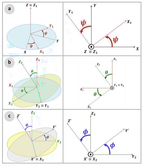 Figure 3 shows the Euler angles sequence for aerodynamics [18]. Figure 3a shows the first rotation around the Z axis, by the yaw angle , which carries the frame to the frame , where the axis Z is congruent to ; Figure 3b presents the second rotation, around the Y axis, by the pitch angle , moving the frame to the frame , where the axis is congruent to ; Figure 3c shows the third and last rotation, in the X axis, by the roll angle , rotating from the reference frame to the final frame. The notations , and for the Euler angles yaw, pitch and roll, respectively, are canonical in the literature and, therefore, are employed in this work.