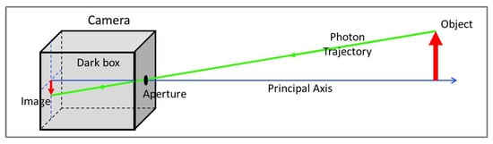 Photographic cameras are devices that are able to record images from the three-dimensional world in bidimensional surfaces, or the image planes. Their construction is very simple, consisting of a dark box with a small aperture; the photons, reflected on the object surface in the three-dimensional world, will pass through the aperture and will form the image on the opposite surface of the dark box, where an optical sensor may be placed. Figure 4 shows this scheme.