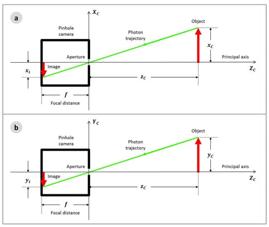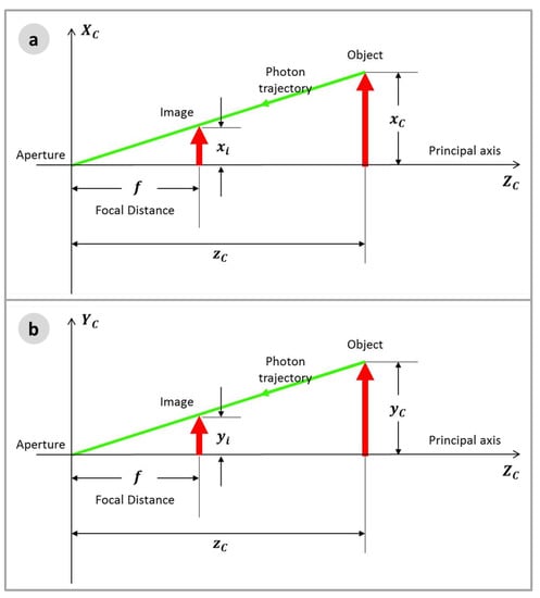 From Figure 6a the relation between the coordinates , in the Image frame (i), and , in the Camera frame (C), is obtained, where f is the focal distance.