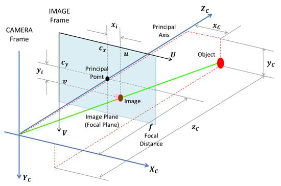 As the objective is to obtain the object’s metric coordinates in the camera frame from the object’s pixel coordinates in the image frame, Equation (36) then becomes: