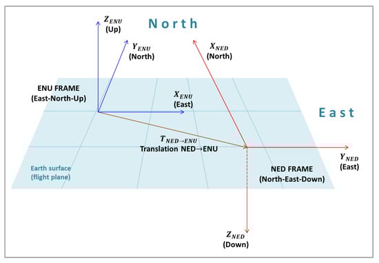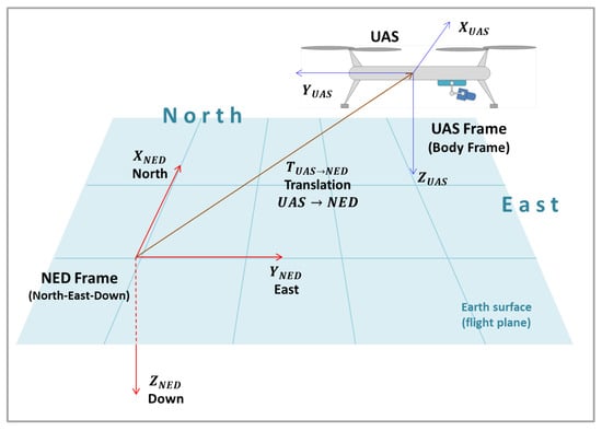 The following step is transform the object’s coordinates from the UAS Frame to the NED Frame (North-East-Down Frame). Figure 10 presents the scheme, also considering a translation vector , which is the position of the origin of the UAS frame in the NED frame, if there is a difference between the origins of the reference systems.