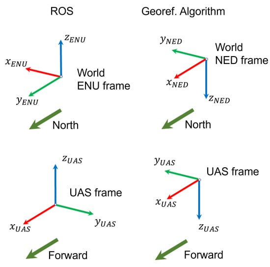 There are many different orientation frames in the process of direct georeferencing aerial images acquired by cameras mounted on UAS. First, the image frame, then the camera, gimbal, UAS (or IMU) and the geographic/world (NED and ENU) frames. In this work, in order to follow the literature and most common applications, two world frames were considered: the NED (North-East-Down); and ENU (East-North-Up) frames.