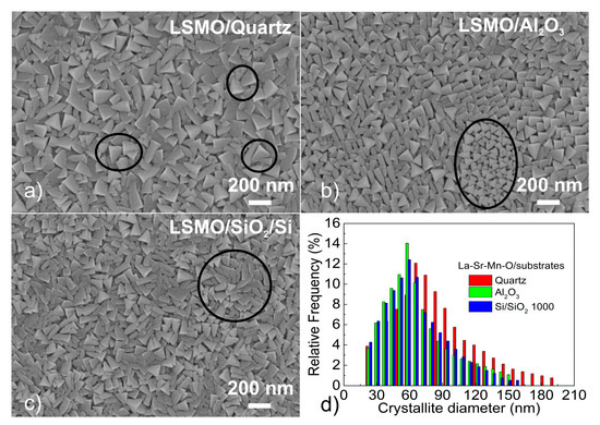 SEM images of surface morphology of 360 nm-thick LSMO films grown on different substrates are presented in Figure 1. The surface of the films contains triangular shape crystallites with some polygonal-shaped grains. The surface morphology of the films grown on monocrystalline quartz (Figure 1a) is different in comparison to the films grown on polycrystalline Al2O3 (Figure 1b) and amorphous Si/SiO2 substrates (Figure 1c). Figure 1d presents a histogram of the crystallite size distribution obtained from SEM images. One can see that crystallites grown on quartz have larger dimensions (most frequent crystallite maximum at 70 nm) in comparison with other films (maximum at 60 nm) and is more spread indicating a larger amount of different crystallite dimensions. It is probably caused by the crystalline surface of quartz and large crystallites of Al2O3 substrates. For these substrates, in the initial stage of films growth, nuclei are more oriented and larger than on amorphous SiO2. Moreover, it has to be noted that polycrystalline Al2O3 substrates are made from an ingot, which consists of grains of about 2 μm in dimensions. When cutting into disks, a surface of substrates is formed by grains of different sizes and crystallographic planes. Therefore, during the initial growth process, the LSMO film starts to grow on different planes and size of Al2O3 crystallites; thus, SEM images show some islands in which shape of the LSMO crystallites is different from the other parts of the films (see Figure 1b). SEM images of thinner films (60 nm) showed much smaller crystallites.