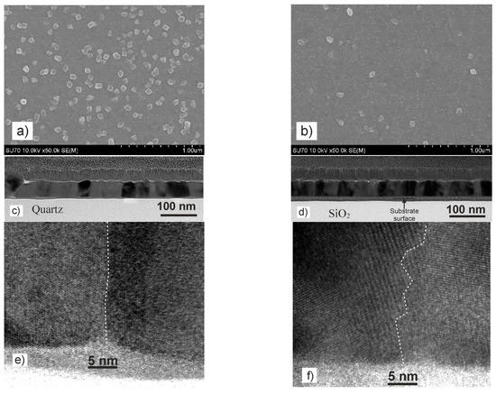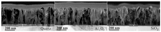 The role of the substrates on the film interface was examined by analyzing the distribution of the main elements across the film thickness. The TEM-EDS line profiles of these elements and cross-sectional STEM Z-contrast images of the films grown on quartz and Si/SiO2 substrates are shown in Figure 4. The initial position of the substrate surface is shown in these figures by the black line.