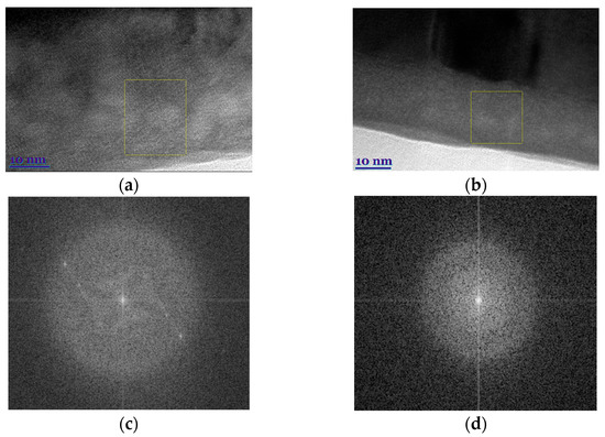 HR TEM image of an interface between the LSMO film and substrate: quartz (a) and Si/SiO2 (b). Fast Fourier transformation (FFT) patterns of the marked square area (c,d), respectively.