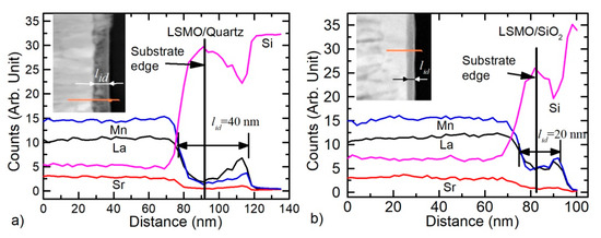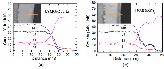 Moreover, at this growth stage of LSMO films, the intermediate layer of 15 nm was more pronounced on Si/SiO2 substrate, whereas on quartz, this layer was only 5 nm thick. The TEM-EDS diffusion profiles of the main elements (see Figure 7) confirmed the mutual diffusion. The same diffusion lines of the elements (La, Sr, Mn) towards substrate and the opposite direction (Si towards the film) were determined for the thinner LSMO films in comparison to the thicker films grown on Si/SiO2 substrates (see Figure 4b and Figure 7b). However, in contrast to the thick films, the diffusion profile of La, Mn, and Sr into the quartz substrate is different; it has the same Gaussian-like shape as the Si diffusion into the LSMO film (see Figure 7a).