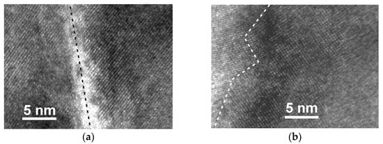 The HR TEM image of the crystalline part of the film grown on different substrates was studied to evaluate the quality of crystallites and grain boundaries. Figure 5 presents an interface of two adjacent LSMO grains of the film grown on quartz and Si/SiO2 substrates (positions of these places are shown in Figure 2). In both cases, crystalline phases of LSMO grains with grain boundary regions can be observed. However, for the films grown on quartz, the border between the grains is more perfect than for films grown on Si/SiO2. For example, in Figure 5a, the two neighboring crystallites are tilted only by a few degrees, and the boundary between them is straight with the width of the grain boundary of about 1 nm. In opposite, the boundary between crystallites grown on Si/SiO2 substrate have a zigzag shape with a width of about 2–3 nm.