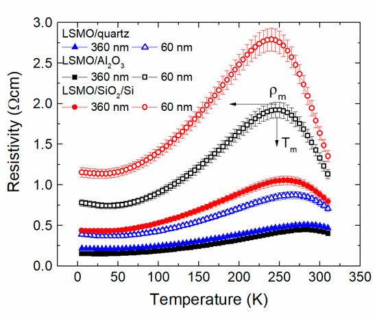 Resistivity vs. temperature dependences of LSMO films with different thicknesses (60 nm and 360 nm) grown on different substrates: quartz, Al2O3, and Si/SiO2. The error bar shows scatter of the results of several samples fabricated from the same film.