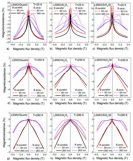 The low-field magnetoresistance dependences on magnetic flux density (B) measured up to 0.75 T at different temperatures are presented in Figure 9 for two field configurations: B parallel (B||) or perpendicular (B⊥) to the film plane. The measurement temperatures corresponding to the ferromagnetic state (25 K), close to metal–insulator transition (250 K) and paramagnetic state (290 K) were chosen. The MR was defined as follows: MR = 100% × [ρ (B)−ρ (0)]/ρ (0), where ρ (B) and ρ (0) are field and zero field resistivity, respectively. The main features of the MR are more pronounced at low temperatures. Figure 9a–c show MR(B) dependences at 25 K. For B||, one can see sharp positive MR changes at a low magnetic field, maxima of which are attributed to the coercive field of the films. Additionally, a sharp increase in the negative magnetoresistance (the large decrease in electrical resistance) at low fields and a slower background negative MR in high field is observed with increase in the magnetic field. These effects are usually called low-field magnetoresistance (LFMR) and high-field magnetoresistance (HFMR), respectively.