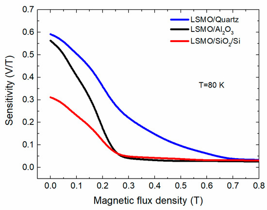 Sensitivity dependences on magnetic flux density (B||) for LSMO sensors produced from films grown on different substrates. Measured using voltage supply of Vs = 2.5 V.