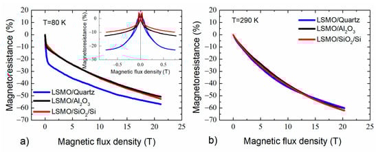 Magnetoresistance dependences on magnetic flux density for 360 nm thick films grown on quartz, Al2O3, and Si/SiO2 substrates are shown in Figure 11. The measurements were performed using pulsed fields up to ~20 T at ambient temperatures (a) T= 80 K and (b) T = 290 K. For comparison, the inset in Figure 11a presents LFMR measured by different technique (in a permanent field using an electromagnet).