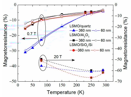 Figure 12 summarizes the temperature dependences of the MR measured at B = 0.7 T (left scale) and 20 T (right scale) for LSMO films grown on different substrates. One can see that, at low temperatures, the LSMO/quartz films are preferable for sensors applications. At room temperature (290 K), the MR is similar for all films independently on thickness and used substrate. The highest MR magnitude obtained at 250 K for LSMO grown on Si/SiO2 could be explained by the fact that the MR usually is highest in the vicinity of the metal–insulator transition temperature. In this case, Tm of this film was 260 K, which is close to the measurement temperature (250 K).