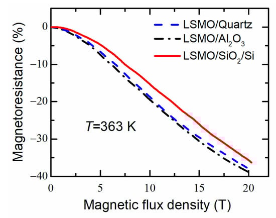 Figure 13 shows the MR measured at higher than room temperature (363 K) for LSMO films grown on different substrates. One can see that, at higher temperatures, the MR at low fields is reduced; however, it still remains significant at high fields (MR magnitude (~35–39%) at 20 T). The largest MR values are obtained for the films grown on quartz and Al2O3 substrates. The LSMO/quartz and LSMO/Al2O3 films show highest and almost the same magnetoresistance values at the whole magnetic flux density range up 20 T. Smaller MR values for film grown on Si/SiO2 substrate could be explained by a reduced metal–insulator transition temperature (Tm = 260 K) in comparison with films on other substrates (285 K). Thus, at 363 K, the LSMO on Si/SiO2 substrate is in paramagnetic state and higher fields are required to align magnetic moments of Mn.