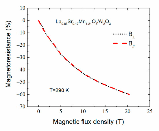 As mentioned in Section 3.3.1, another important parameter for B-scalar magnetic sensors application is magnetoresistance anisotropy. Figure 14 presents the magnetoresistance of 360 nm-thick La0.83Sr0.17Mn1.21O3 film deposited on Al2O3 substrate measured at 290 K temperature up to 20 Tesla. There is only a slight mismatch between the MR in B|| and B⊥ configuration at B < 1 T; above this value, the curves practically overlap. This confirms that, in high magnetic fields, the MRA of investigated nanostructured LSMO films is negligible.