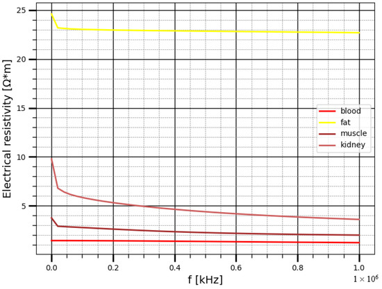 However, in order to achieve high accuracy of determining the amount of blood per 100 G of kidney tissues using attached non-invasive electrodes, it is required to develop a detailed specific mathematical model of the region of interest as well as a method to eliminate the effect of surrounding organs and tissues. Improvement of this technique can allow its application for monitoring patients undergo different type of cardiovascular surgeries, who need a monitoring to prevent the acute kidney injury, which is a common complication after cardiac surgery and is associated with increased morbidity and mortality and increased length of stay in the intensive care unit [8]. Furthermore, the develop of such system with precise measurements can be used for acute kidney allograft rejection diagnosis. In related previous work [9] belongs to the authors of this paper, different biophysical models were considered to describe the kidney and take in to the account the electro physiological parameters, and the depth of kidney. Nevertheless, these models are more reliable for non-obese patients and children because as the kidneys are located deeper the impact of the surrounding tissues become greater and hence leads to an error of determining the amount of blood per 100 G of kidney tissues. However, the desirable area to acquire the electrical impedance signal can be presented as a multi-layered model; these layers specify the biological tissues of the region of interest, which are: the skin, subcutaneous fat layer, the soft muscle layer, the fat layer around the kidney, and the kidney layers. According to the analysis of the electrical properties of biological tissues at several excitations frequencies that has been considered in related works [9,10], it was concluded that the most adequate frequency range is 80–100 kHz where active resistance is the main component of impedance. Thus, at lower frequencies the impact of capacitive part increases, which is determined by the heterogeneity of tissue structures in the region of interest, furthermore the low frequencies can cause seizures and polarizing electronic phenomena. Thus, an electrical current with 100 kHz has been used during this study. Figure 1 shows the electrical resistivity of biological tissues in the study area in different frequencies including 100 kHz [11]. Four electrode system configuration was proposed in this study to provide the desired accuracy for bio-impedance measurement, thus two outer electrodes are used to inject a small alternating current into the human body the voltage drop is measured to calculate the complex impedance [12].
