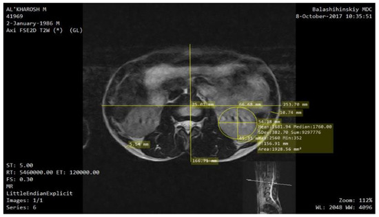Numerical modeling has been conducted using a simulation platform COMSOL Multiphysics 5 [13,14,15]. MRI images have been used as an input for 3-D model creation. The preliminary processing was carried out using MicroDicom [16]. In order to reduce the calculation time, the right kidney was considered during the numerical modelling. During this study, the actual kidney size, the dimensions of the patient’s torso, the thickness of subcutaneous fat and muscle layers, as well as the distance of the kidney relative to the center of the trunk cross-section were outlined as shown in Figure 2.
