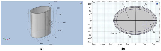(a) Model of the perirenal space in the COMSOL Multiphysics 5.5 software; (b) Geometric parameters of the model (cross section), where 2a1—is the major axis of the ellipse (cross section of the trunk), 2b1—is the minor axis of the ellipse (cross section of the trunk), hsubc—is the thickness of the subcutaneous fat layer, hm—thickness of the muscle layer, hc—thickness of the renal cortex.
