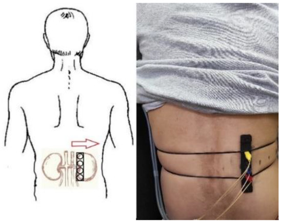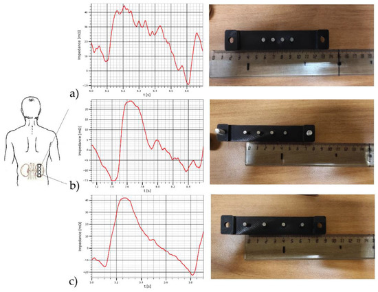 Figure 6 shows the electrode system positioning during the experiment. The studies were carried out in the area of the right kidney and electrical impedance mapping were performed with 20 mm shifts to the right due to the design dimensions of the electrode system used. In order to reduce the influence of kidney displacement during breathing, the measurements were taken with breath holding. The measurements were carried out several times to confirm the reproducibility of the obtained signals; uniform conditions as well as the degree of pressing of the electrode system were provided.