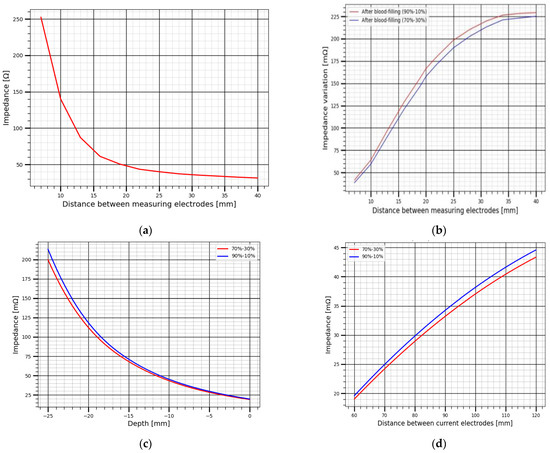 The change of electrical impedance obtained by numerical modelling: (a) the variation of static impedance with increasing distance between measuring electrodes, (b) the variation of pulsatile impedance with increasing distance between measuring electrodes, (c) the variation of pulsatile impedance with increasing kidney depth, (d) the variation of pulsatile impedance with increasing distance between measuring electrodes at the maximum kidney depth.