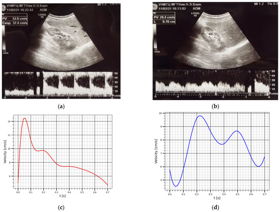 This velocity curves obtained using ultrasound: (a) The renal artery blood velocity; (b) The renal vein blood velocity; (c) The averaged renal artery blood velocity; (d) The averaged renal vein blood velocity.