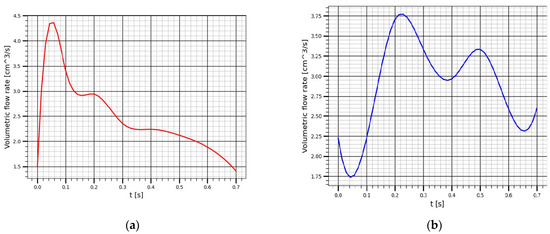 Using the obtained curves, it is easy to achieve to the dependences of the volumetric flow rate. Thus, the values of the blood flow velocities at each time point were multiplied by the cross sectional area of the renal artery and renal vein to get the corresponding volumetric flow rate for renal artery and renal vein as shown Figure 10. The obtained volumetric blood flow curves were used for the integral calculation of the change in blood volume over one cardio-cycle.
