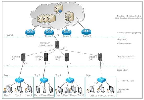 At the fog layer, the communication is thought to be initialized by all the devices at one point in time or independently. As shown in Figure 2, a couple of AS/gateway servers that are most reliable are selected as distributed database servers. Some other AS can be reserved to keep a backup of the user IDs in the blockchain/cloud. Distributed database systems are used here for registering all user’s C within all organization branches/universities so that a single immutable and distributed ledger copy is maintained in a couple of servers AS across the country to avoid redundancy. The blockchain [39] is known to have the features of trustability, transparency, and reliability. The use of the blockchain proof-of-stake (PoS) [16] has been found to be more suitable as the creator is based on the amount of work performed or random selection. Thus, from each organization branch/university, a single authority will register all user IDs C in the blockchain. Henceforth, once the user C is registered successfully, then C becomes eligible to achieve secure authentication across any branch of the organization/university within the country.