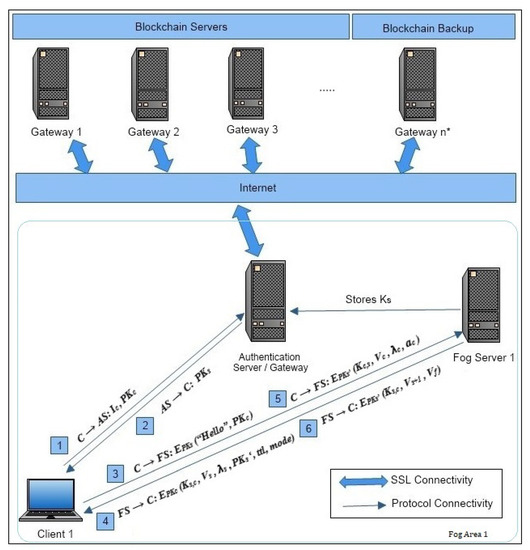 As shown in Figure 2, the architecture is designed such that all client’s C are connected to the dynamically selected fog server FS within the university/organization. To select the dynamic fog server FS, first, client C needs to provide his/her identity to the AS, which then confirms its validity from the digital identity blockchain. Once the validity is confirmed, it is then provided with the public key of the latest FS, which then authenticates all local client’s C within that fog. The performance evaluation of the protocol security level considered is less than 400 bit depending on the mode, as the encryption/decryption algorithm we used is 272 bit (LES).