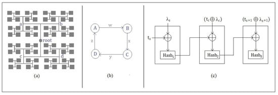 Challenge model. (a) Balanced tree with a superfluous sub-branch having 4 × 4 nodes. (b) Directed graph transition matrix in each node. (c) Hash-chain flow.