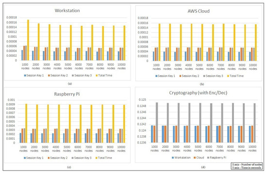 Table 7 shows the comparison of the computational cost for some of the protocols that were found to be relevant. denotes the time required to calculate the one-way hash function, the running time for the encryption/decryption of cryptographic operation, and the time required to calculate the zero-knowledge-proof-based challenge–response operation for authentication. It can be seen that the hash-chain protocol performed better in comparison. A telecare medical information system that utilized a lightweight authentication protocol was demonstrated by Amin et al. [45]. The objective of this research work was anonymity preservation for the remote patient communication with the hospital by using a smart card. The entities involved were the home medical server, foreign medical server, physician server, and patient. The protocol involves multichannel connection and is mostly dependent on the hash of group identities for the protocol authentication. In wireless sensor networks, a real-time data access scheme using a lightweight three-factor scheme was implemented by Luo et al. [46]. A three-factor authentication scheme including biometrics, passwords, and smart cards was implemented between the entities of the user, gateway node, and sensor node. Twelve criteria were satisfied within this scheme with the confirmation of the fuzzy extractor. The authentication of remote users with key agreement was presented by Kumari et al. [47]. This scheme involves three entities as the user, smart card, and server, which can help update the passwords on the smart card. This scheme is usually operated by a combination of the timestamp, identity, passwords, and random numbers. It can be noticed that most of the protocols used only hash operations, which are quite vulnerable. The hash-chain performs better when authentication is required for a large number of devices because of the channel encryption. In Table 8, it can be seen that the hash-chain protocol still achieved better performance than the traditional RSA [40] algorithm with respect to the time requirements on Contiki OS, Cooja with Rime–Tmote Sky @ 3.9 MHz. In Table 9, an Ethernet comparison of hash-chain fog/edge protocol performance is shown. First, the workstation as a server authenticates the Raspberry Pi as the client. In the second part, the Raspberry Pi as a server is connected to authenticate another Raspberry Pi as the client. As both of the Ethernet connections have configurations as in Table 9, it can be noticed that due to the high computing power of the workstation, the protocol completion time without encryption/decryption was much less than the Raspberry Pi counterpart.