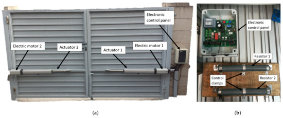 To carry out this study, an electronic board was used as an example of the type of devices of interest. This board is a euro 230m2 model (VDS Automazioni srl, Spoltore, Italy) and is normally used to control the automatic opening and closing of swing doors. This device is directly connected to a 220 V voltage and is in charge of powering two direct current electric motors, which produce the necessary force to make one or more actuators move the elements that open and close the gate (Figure 1a).