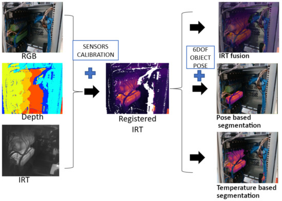 One of the main features of the MANTRA system is that it can augment the color information integrating the IRT information. In this way, it is possible to show the temperature of an isolated 3D object, as well as that of its various components, on top of the color image with associated virtual information, both precisely and in real time. To achieve this IRT fusion, it is necessary to calibrate each of the sensors, place them in the same coordinate system (extrinsic parameters) employing a stereo calibration, and overlap the registered images using the information of the previously calculated 3D object pose. The details of the IRT fusion can be found in [28].