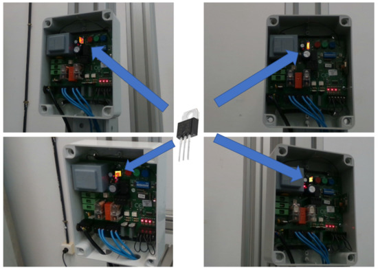 - Overload in the outputs to the actuators. This malfunction case corresponds to irregular operating conditions caused by abnormal circumstances in the output loads. At the laboratory level, this case was simulated by reducing the resistance connected to the board, therefore increasing the operating current flow. In a real scene, these circumstances could correspond to disconnections in a gate system, for instance. Eventually, these malfunctions will cause the break of the electric motors commanded by the board.