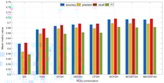 The results obtained in the analysis of the different possible combinations of ROIs are summarized in Figure 6. The assessment of each individual model was carried out by cross-validation with 10 stratified partitions [41,59]. This figure includes the average values obtained for different combinations of analysis ROIs, considering all types of models and all investigated features. Figure 6 shows that the average prediction capacity of the models increases if a greater number of regions is used. This is because, with a small number of ROIs, it is not possible to correctly predict all failure cases. As more features are considered, the models have more information to classify the cases. It may also be observed that not all areas provide the same information quality. Specifically, the combination DEFGH produces worse results than BCFGH. Moreover, there is a point in the process of adding ROIs to the training of the models where a higher number of ROIs hardly improves the results or even worsens them.