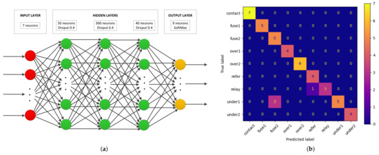 The predictive models were trained with the previously shown features and were experimentally configured in a heuristic way. The RF model was configured with 1000 estimators, with Gini criteria and with splits until the leafs contain two samples or less. The KNN was configured to group 15 neighbors and consider the Minkowski metric, and the ball-tree algorithm was used to perform the classification. The SVM model was configured with radial-basis kernel and one-vs-rest (ovr) decision function. The architecture used to configure the ANN was a sequential scheme with three hidden layers of 50, 300, and 40 neurons, each one with a ReLu activation function and a dropout of 0.4. The output layer contained nine neurons with softmax activation. The training was carried out for 80 epochs with a categorical cross-entropy loss function and an Adam optimizer with a learning rate of 0.01 (Figure 7a).