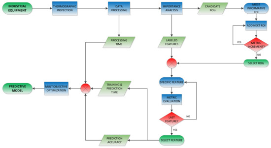 A relatively novel predictive maintenance technique that is gradually spreading in the industrial sector is an infrared thermography (IRT)-based technique [5]. IRT is a technology that measures radiation within the infrared spectral range that an object emits and relates it to the actual temperature of the object. Taking into account that the vast majority of failures in industrial equipment and machinery are preceded by significant temperature changes, it may be concluded that the thermal data collected with a thermal sensor is a valuable source of information and can identify problems at an early stage so that they can be corrected before becoming worse and more expensive to repair. Infrared thermography has great potential as a predictive maintenance tool for equipment and facilities that can optimize industrial maintenance costs [6,7,8,9,10]. Although the characteristics of the IRT make it applicable to multiple areas and provide important advantages over other techniques, its scope is still quite limited. Nowadays its use is mainly aimed at detecting existing faults, rather than a true predictive strategy that anticipates the occurrence of failures.