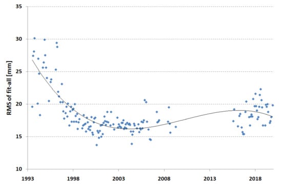 The quality of the orbits of the satellites was characterized by the dispersion of normal points in the form of the RMS of all stations with respect to the orbit. Figure 1 shows the RMS of the fit of all stations’ normal points for both satellites for each monthly arc. A significant improvement in the RMS can be seen in the first period of 1993–2002, the maintenance of the best results can be seen in the period 1998–2009, and a slight deterioration in the last period 2015–2019 resulting from the addition of several weaker stations as core stations for a better station distribution on the Earth’s surface can be seen.