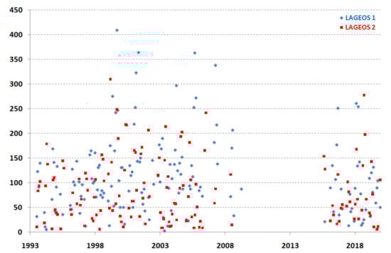 The orbits of the LAGEOS-1 and LAGEOS-2 satellites were computed from the results of 34 selected SLR stations in the form of 120-second normal points [18] taken from the EUROLAS Data Center (EDC). The parameters and models used in the GEODYN-II computations are presented in Table 3. The process of determining the orbits was performed separately for each orbital arc by the Bayesian least squares method using an iterative process (4–5 iterations per arc). The results of the Borowiec SLR station from July 1993 to December 2019 are given in 229 monthly arcs with a total of 18,397 and 12,354 normal points for LAGEOS-1 and LAGEOS-2, respectively. Several criteria used for rejecting normal points and orbital arcs are presented in Table 1. The percentage of rejected normal points for the laser station at Borowiec, after taking into account all the above criteria, was 7% and 6% for LAGEOSA-1 and LAGEOSA-2, respectively. This was mainly due to there being too small a number of normal points per month (below 50), creating the need to reject all points in such cases (56 months).