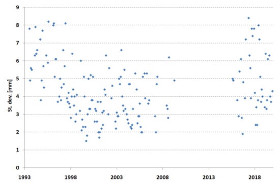 Taking into account the very long period of the study, it should be underlined that the results obtained in particular periods agree very well with the slight improvement in the recent period. The quality of the results is primarily decided by three factors: the number of normal points for each orbital arc; the dispersion of the normal points in relation to the orbit; and variations in systematic deviations—i.e., the long-term stability of range biases.