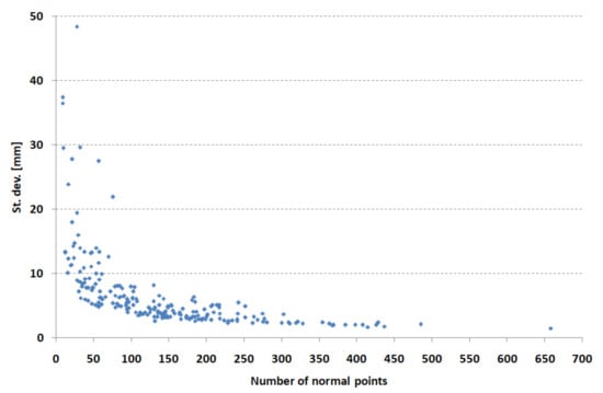 The standard deviations of the coordinate determination are presented in Figure 3. The distribution of these results is similar to the distribution of normal points (Figure 2), which confirms the dependence of the standard deviation on the number of normal points.