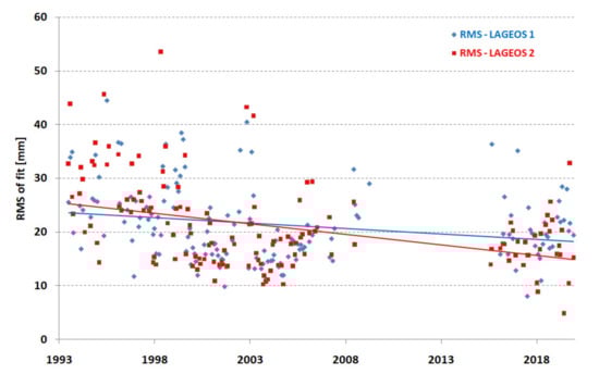 The dispersion of normal points of a given station in relation to the orbit (RMS of fit) is another parameter that affects the precision of determining station coordinates and thus determines the accuracy of measurements. The results obtained for both LAGEOS satellites are shown separately in Figure 5. There is a clear improvement in the orbital RMS over time for both LAGEOS satellites.