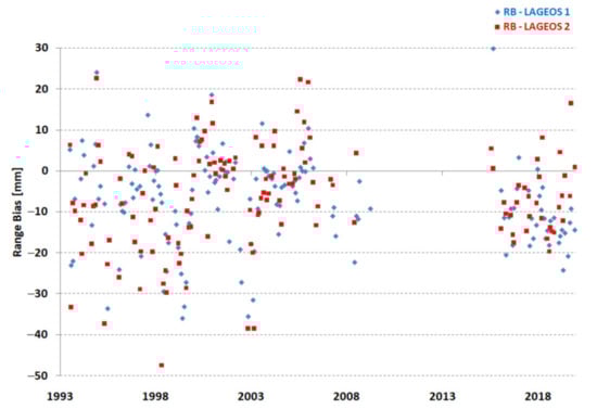 Systematic deviations are characterized by range bias and its changes in the form of long-term stability. Long-term stability is defined as the standard deviation of monthly range bias estimates [1]. The range bias for both LAGEOS satellites should be kept constant so that its fluctuations do not significantly affect the quality of the orbit. The results are presented in Figure 6. In the period of study, all range biases were shifted by approximately −10 mm in comparison to ITRF2014. The long-term stability was significantly better in the period 2015–2019 (Figure 6 and Table 4).