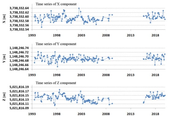 The positions of the stations in the form of geocentric coordinates X, Y, Z were determined independently for the epoch 2010.0 and on the first day of each month from each monthly orbital arc, for a total of 229 positions. All the determined station positions were transformed to the epoch 2010.0 by the station velocity from ITRF2014 (de-trended component). The geocentric positions obtained in this way are presented in Figure 7. The results show a significant jump in the Z component in 2002/2003. Arcs that contained less than 50 normal points for both the LAGEOS-1 + LAGEOS-2 satellites were rejected (55 arcs). Some arcs were removed due to them exceeding the 3xRMS deviations of individual components. The average geocentric coordinates for all periods and for the entire study are presented in Table 5.