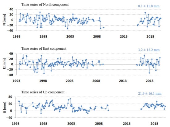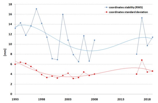 The best estimation of the accuracy (difference between the true and computed values) of the station position is the repeatability or stability of the de-trended station coordinates X, Y, Z or N, E, U computed in the form of 3D RMS [28]. This value for the best stations reaches 4 mm. The stability results and standard deviations of the coordinates determined for annual periods are presented in Figure 10.