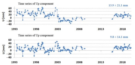 Figure 7 and Table 5 show a clear 2 cm jump in the Z component in the period 2003–2009. To better assess the obtained results, the coordinates were transformed from the geocentric to the topocentric frame (length, width, height) [27]. Differences from the components of ITRF2014 allow for the assessment of changes in the horizontal and vertical planes. The results of the comparison of N, E, and U with the initial ITRF2014 coordinates are shown in Figure 8. These results confirm the jump in the vertical component, which indicates the effect of systematic apparatus error. This jump is also recorded in the ITRF2014 coordinates dated 27 July 2002 as two coordinate values before and after the jump. After introducing the coordinates of the new (after jump) value ITRF2014, the jump in the vertical component was doubled (Figure 9 top). This points to the existence of incorrect Borowiec coordinates in ITRF2014. After changing the coordinates according to the results in Table 5, the jump was completely removed (Figure 9 bottom). The final results of determining the topocentric coordinates after taking into account the above-mentioned correction are presented in Table 6.