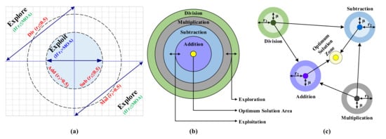 The design of the AOA starts with the usage of four arithmetic operators as per the order given as follows: division (÷), multiplication (), subtraction (−), and addition (+), as shown in Figure 2. The conditions for selecting the exploration and exploitation phases of the algorithm are depicted in Figure 2a. The hierarchical order of these four mathematical operators is illustrated in Figure 2b. In contrast, the mechanism of searching for the optimal solution area is shown in Figure 2c []. In AOA, three phases are involved in finding the best optimal solution, and they are given as follows: initialization, exploration, and exploitation. Comparing Figure 1 with Figure 2 clearly shows that the AOA follows the footsteps of the SCA in finding the optimal solution.