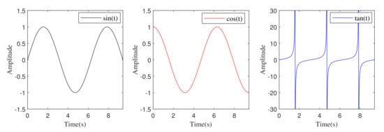 The cyclic and infinite vertical patterns of sin, cos, and tan functions allow the discovered solution to readjust around the nearby solution. This approach guarantees the desired space needs during the exploitation phase in between the two adjacent solutions. During the exploration phase, by adjusting the range of the trigonometric functions, the solutions yield the capability to search outside the space between their corresponding optimum solution zone. A position update is achieved by changing ranges of the sin, cos, and tan functions. Here, the solution repositions inside or outside their search space between itself and the adjacent key. The position update, either inside or outside, is determined by the random number used in the ATOA. Hence, a balance between switching exploration and exploitation is essential, and it is regulated based on MOA. In addition, the range of the trigonometric function is controlled by using MOP. The diverse patterns of the trigonometric functions in the range of are illustrated in Figure 3.